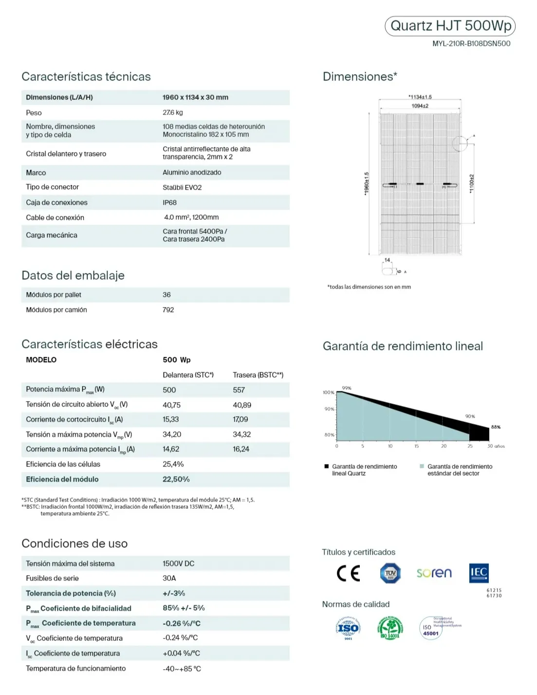 Con una eficiencia del 22,52%, y una tasa de degradación anual del 0,36%, frente al 0,4% de un panel de tipo N, el 450 HJT ofrece una garantía de producción superior durante 30 años.